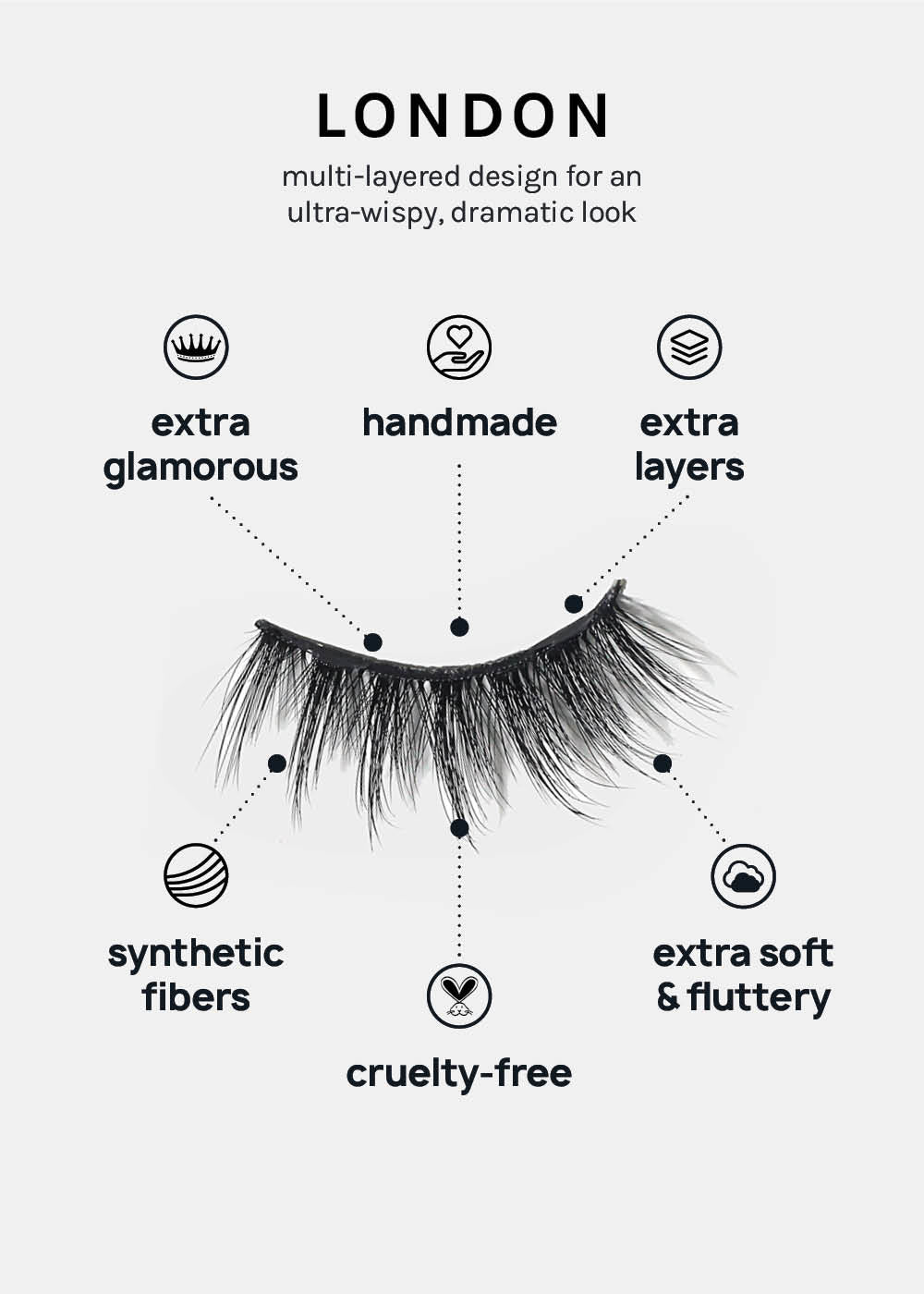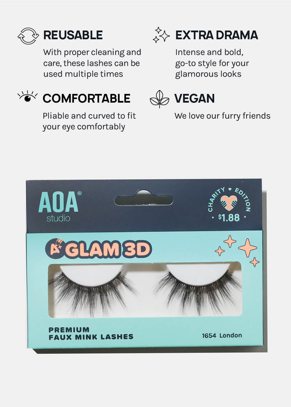 GLAM, super WISPY, + stacked, A+ Glam 3D Faux Mink Eyelashes are 100% Vegan fiber layered to add fluttery length + volume to all eye shapes. Features a wide lash band to last multiple wears.