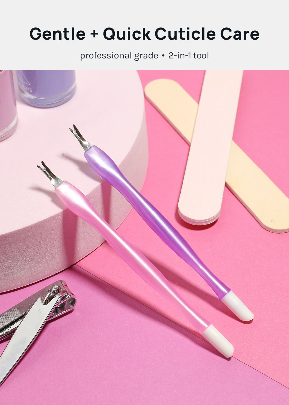 This professional grade 2-in-1 tool provides gentle + effective cuticle maintenance that won’t scratch nails.