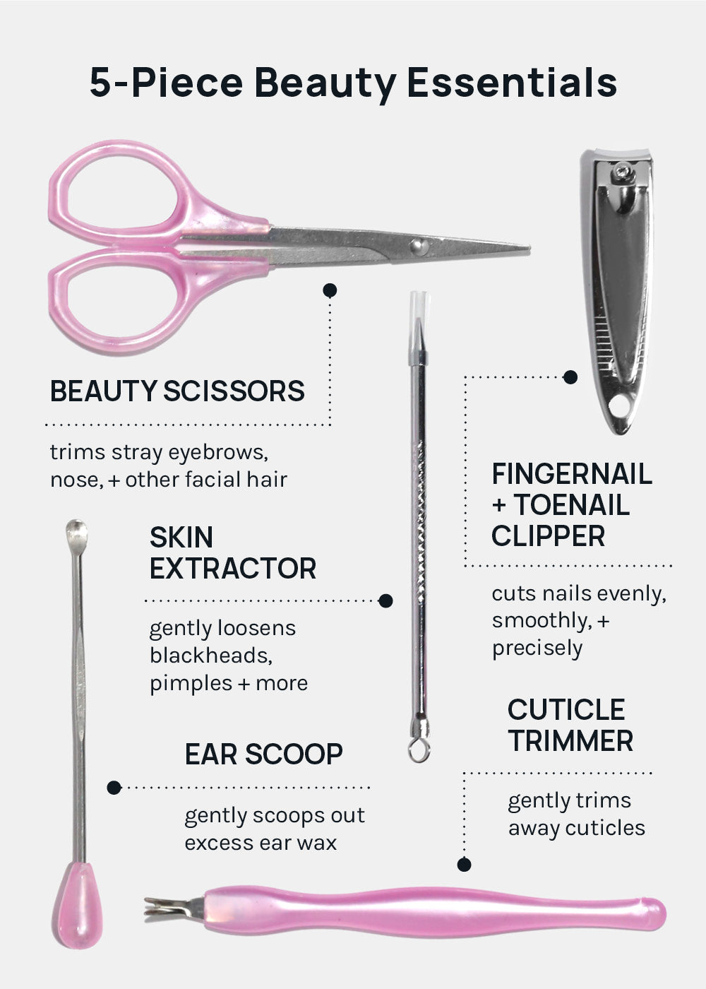 - Fingernail + Toenail Clipper: cuts nails evenly, smoothly, + precisely.