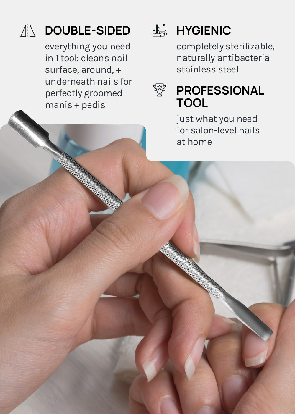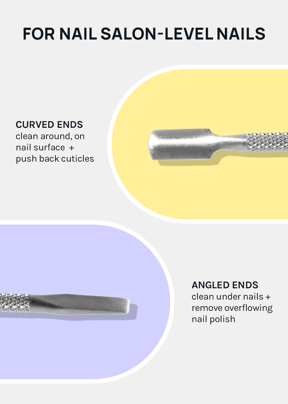 ❣️ ANGLED END cleans under nails + removes overflowing nail polish❣️ CURVED END cleans nail surface + pushes back cuticles