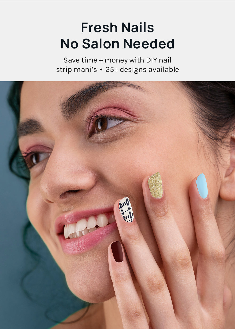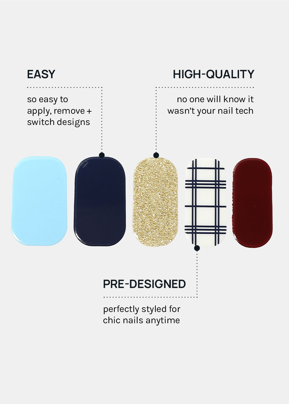 Bye-bye drying time! Create a perfect mani in minutes – just peel, stick, press + file!