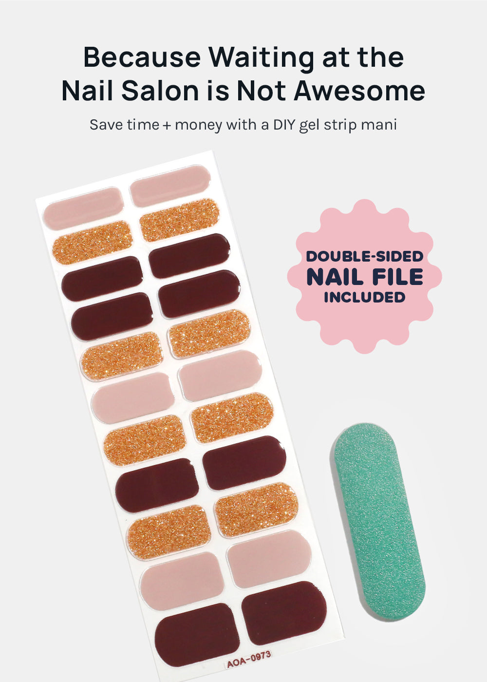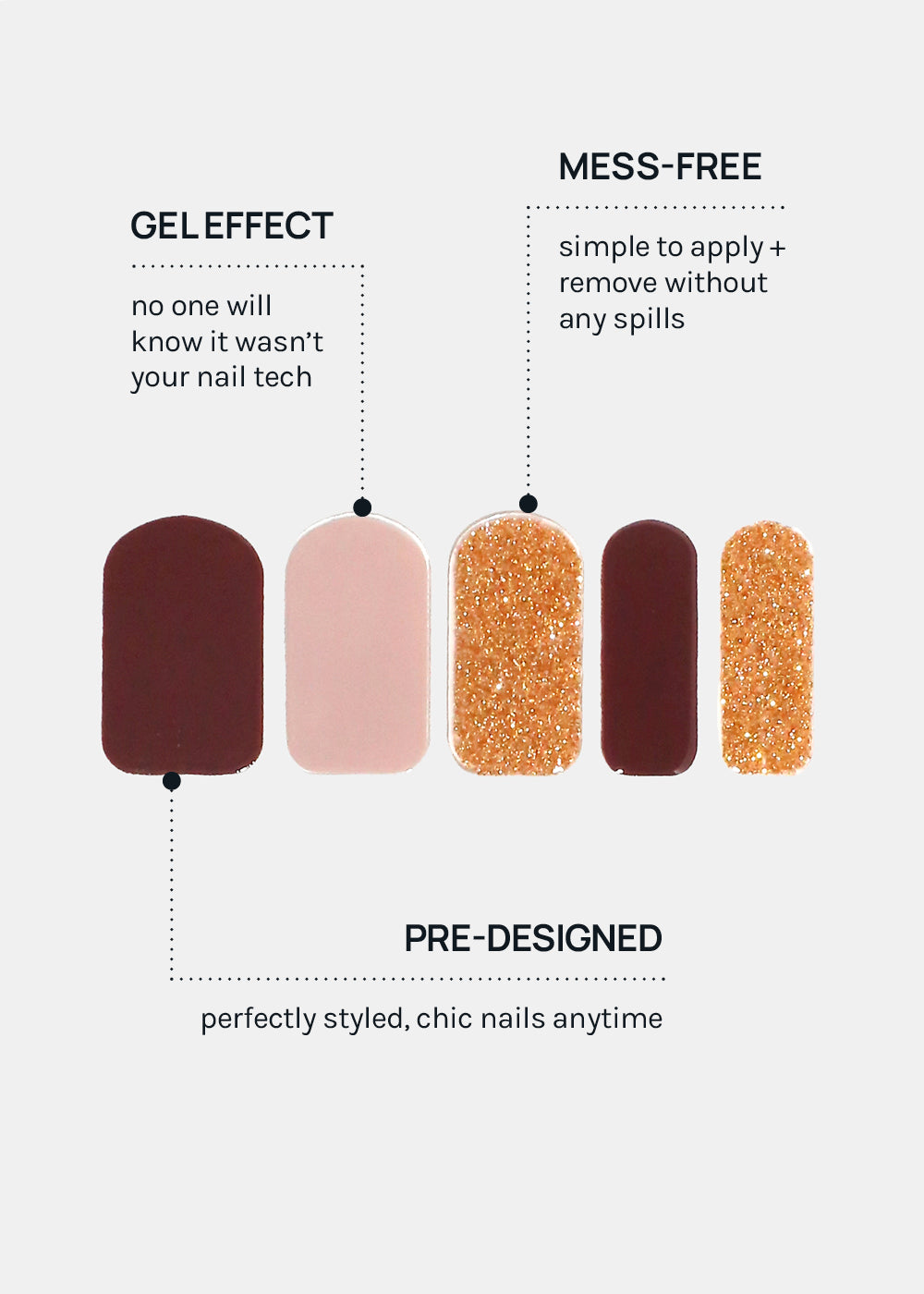 Get an easy mess-free manicure. Just peel, stick, press + file. No glue needed!