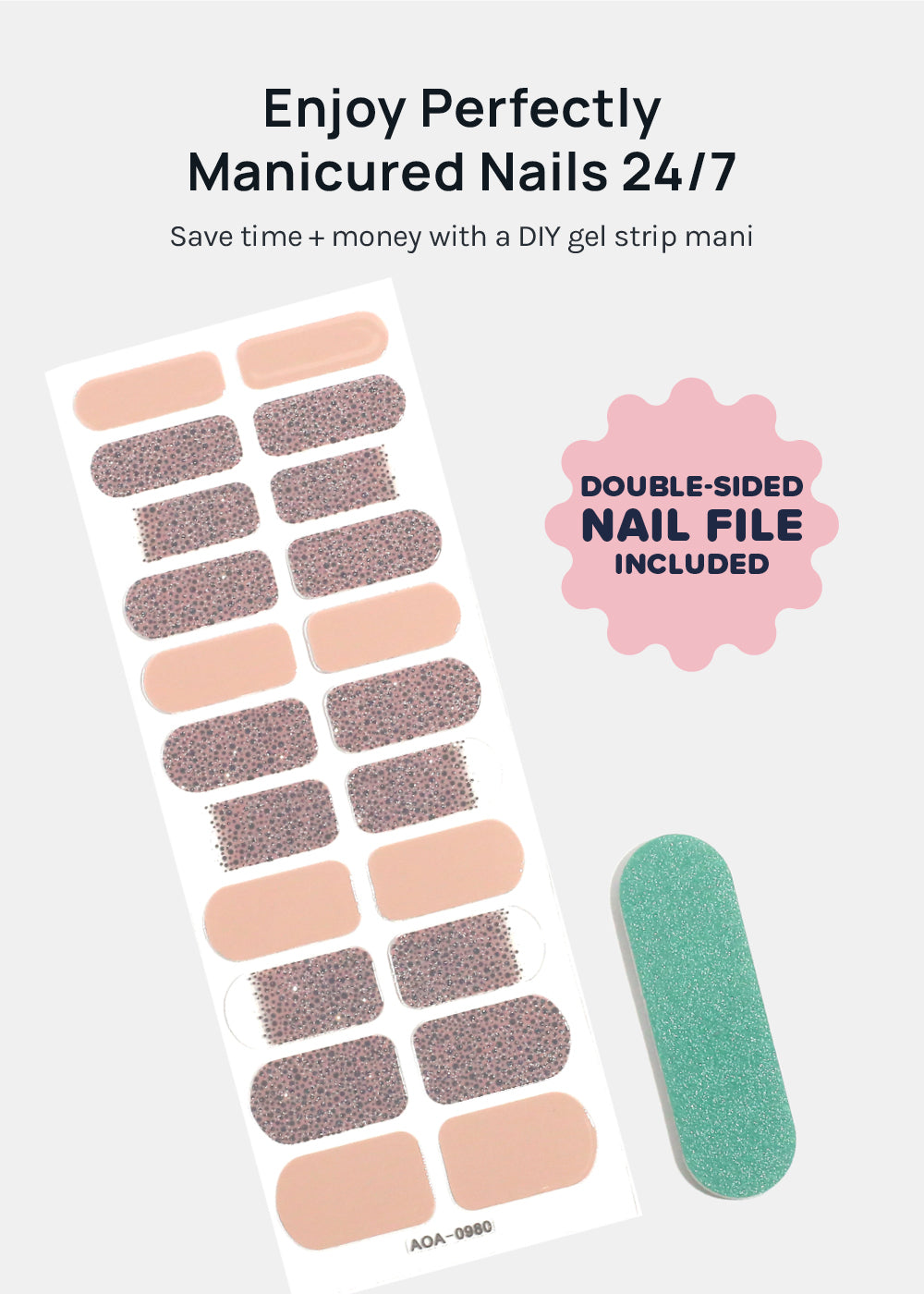4. Fold down excess over the tip of your nail + gently file downwards. Pro Tip: Apply a clear top coat for a glossy, longer-lasting finish.