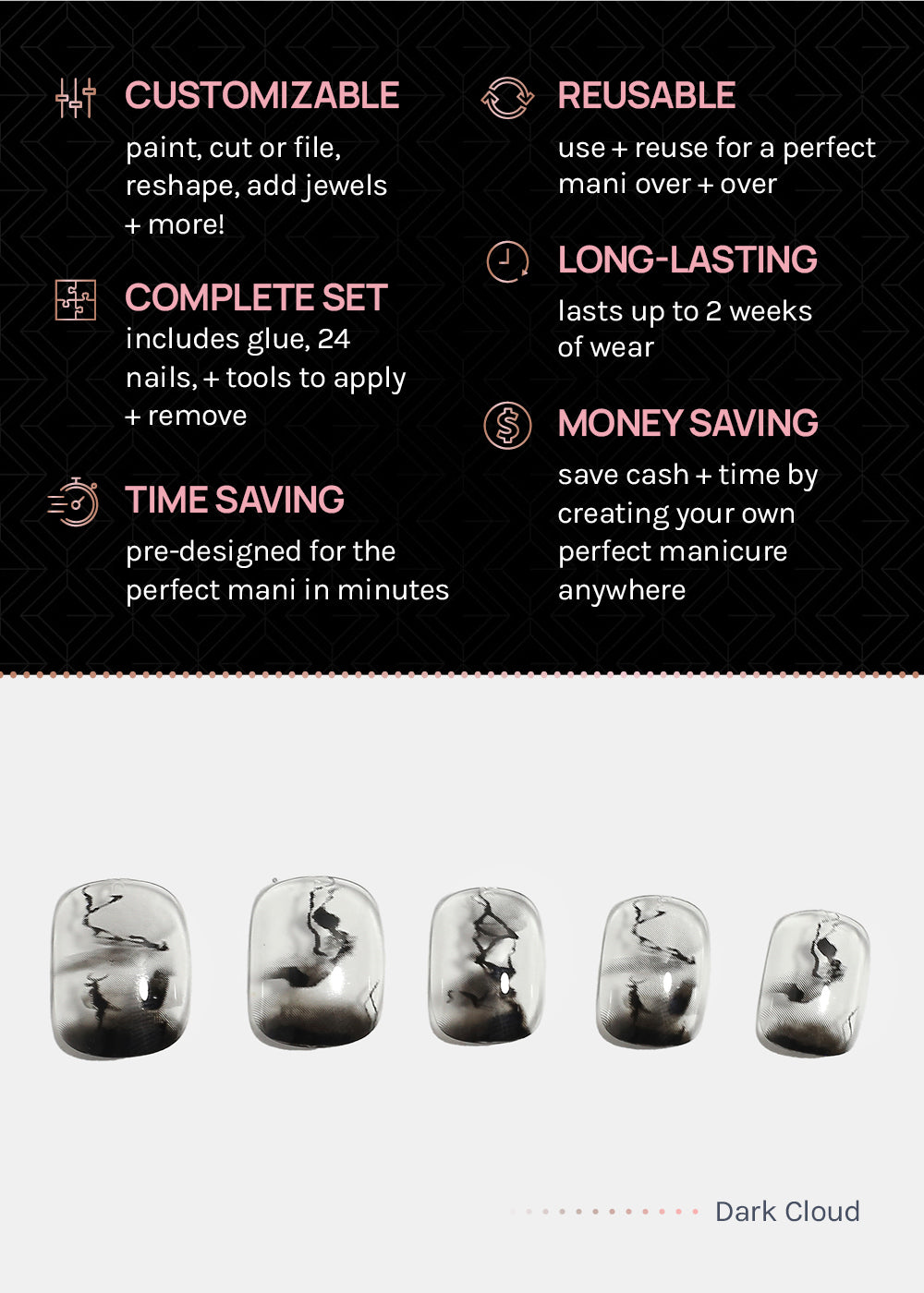 Luxe, durable, reusable nails to create the perfect manicure in minutes.
