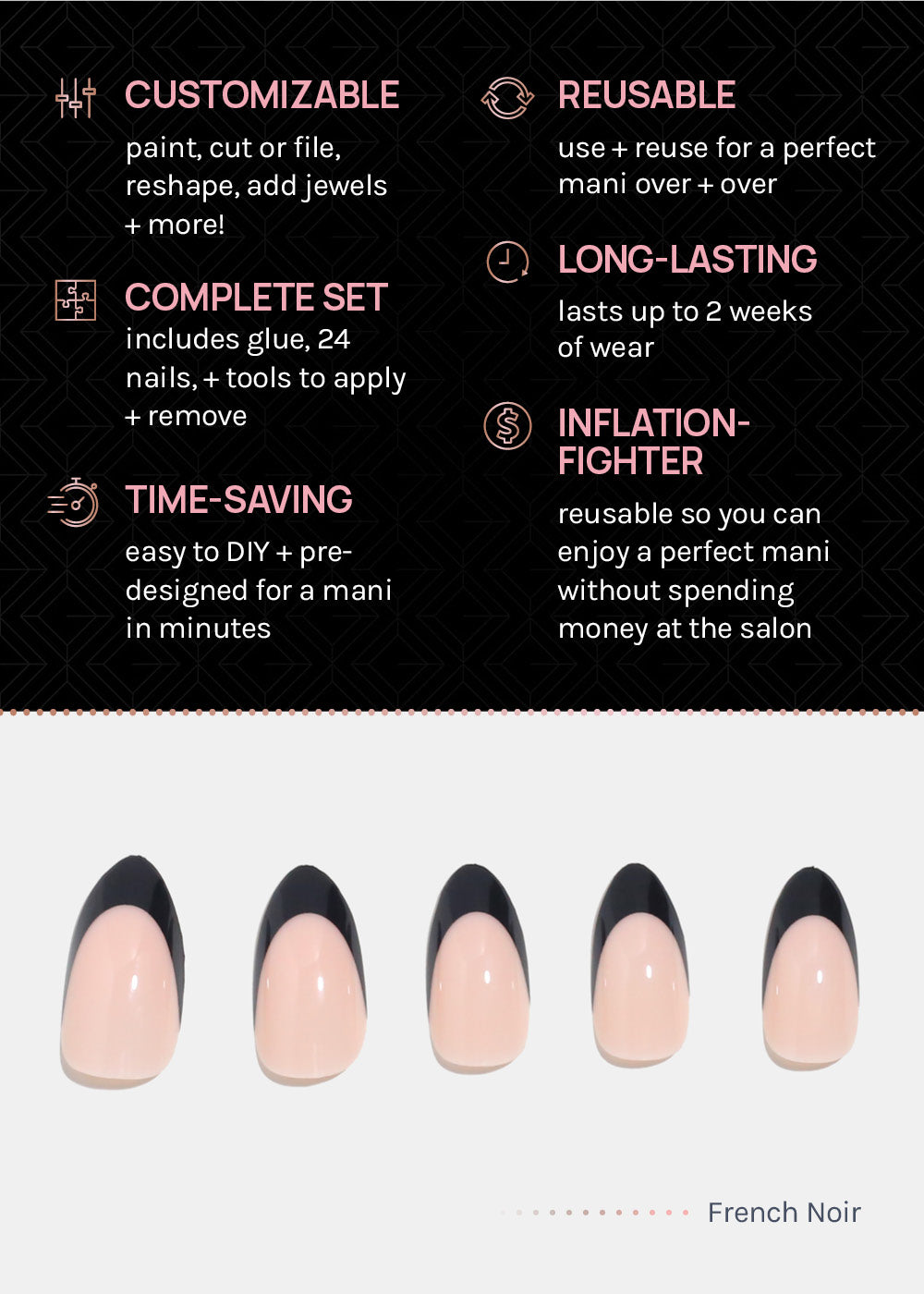 Create a flawless manicure in minutes with AOA Pro Press-On Nails—designed for a luxe look without the salon visit. These durable, reusable press-on nails deliver a smooth, professional finish that lasts, making it easy to switch up your style anytime. Perfect for beginners + pros alike, they apply quickly + comfortably for an instant, polished look at home.