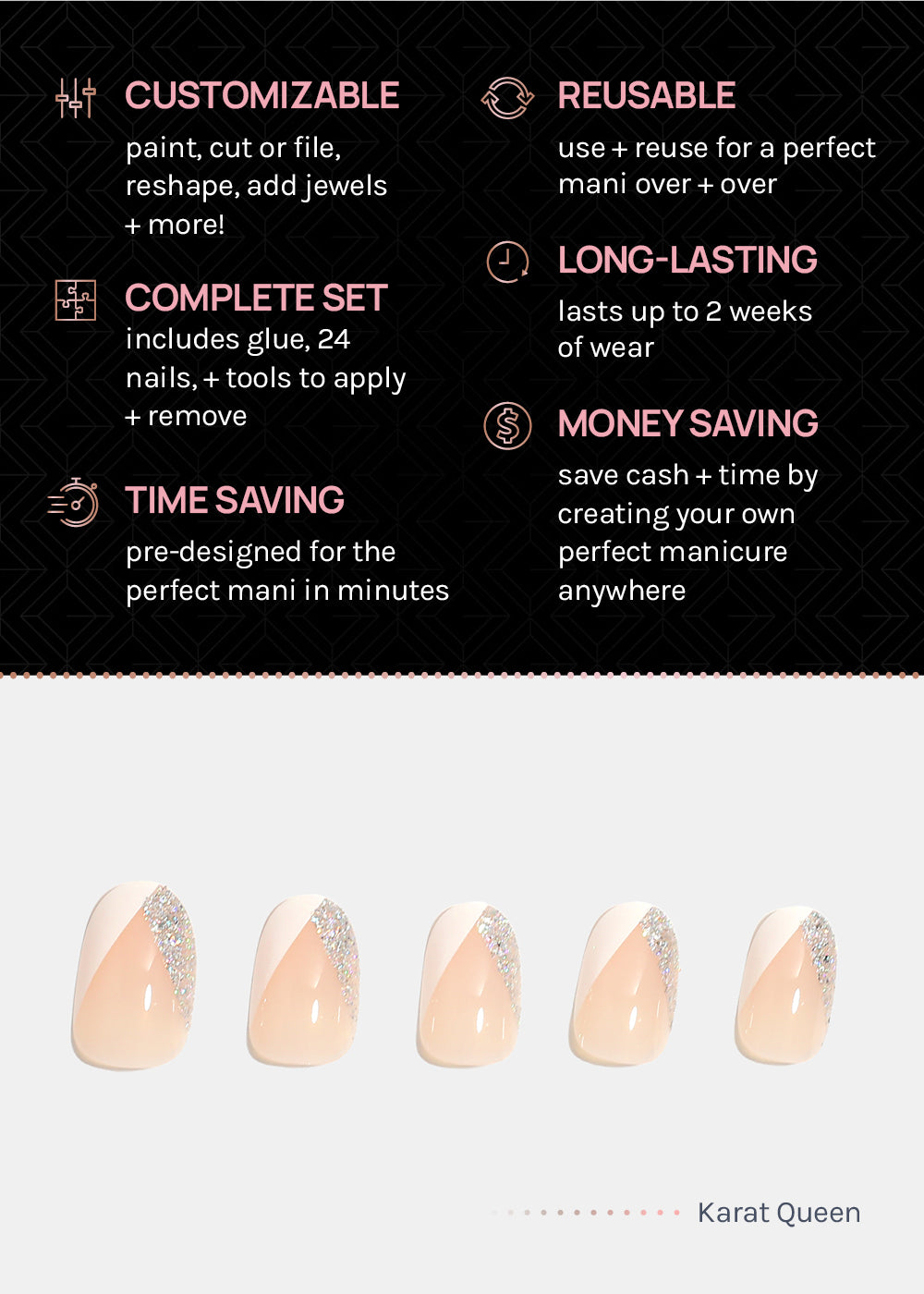 Luxe, durable, reusable nails to create the perfect manicure in minutes.