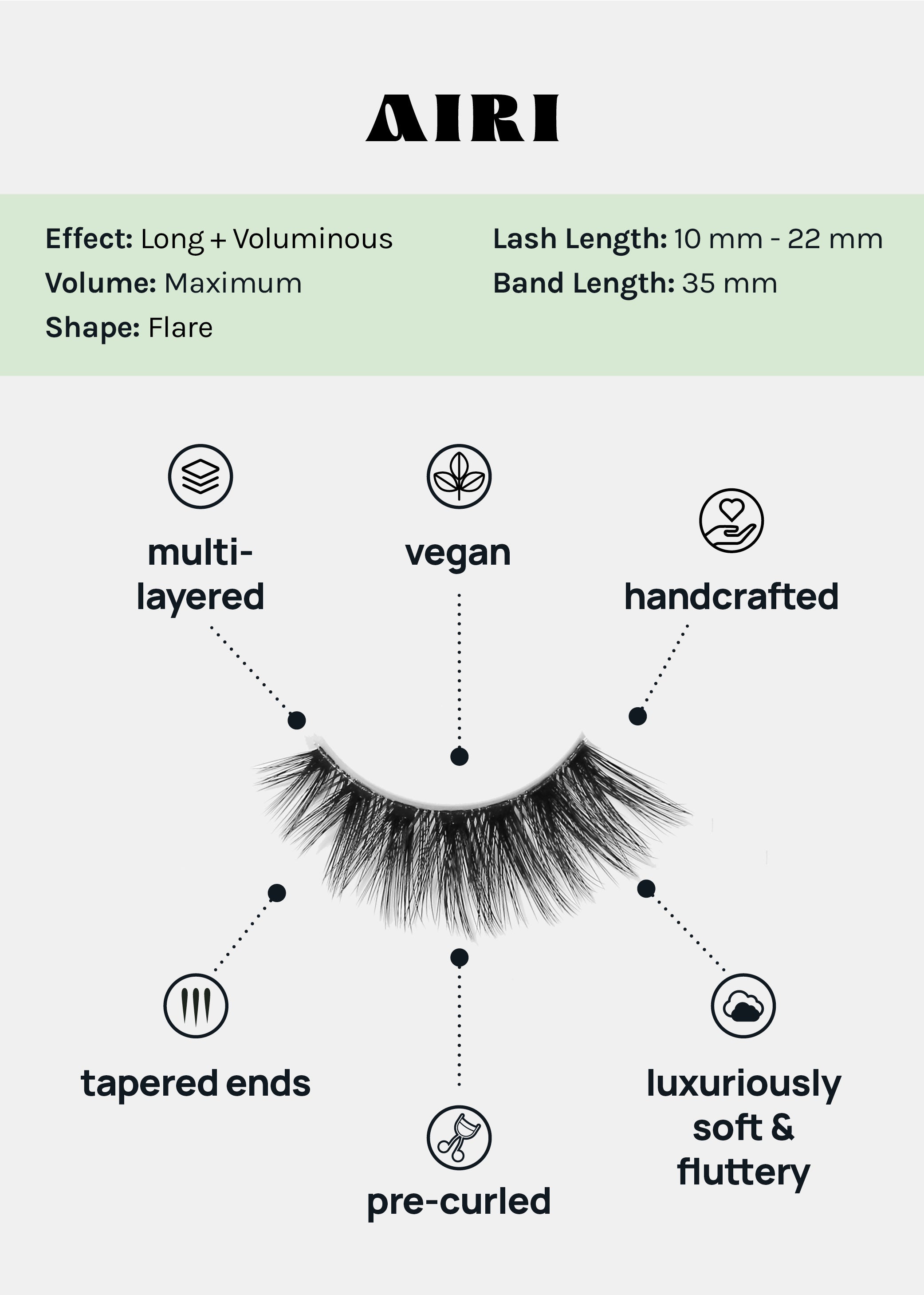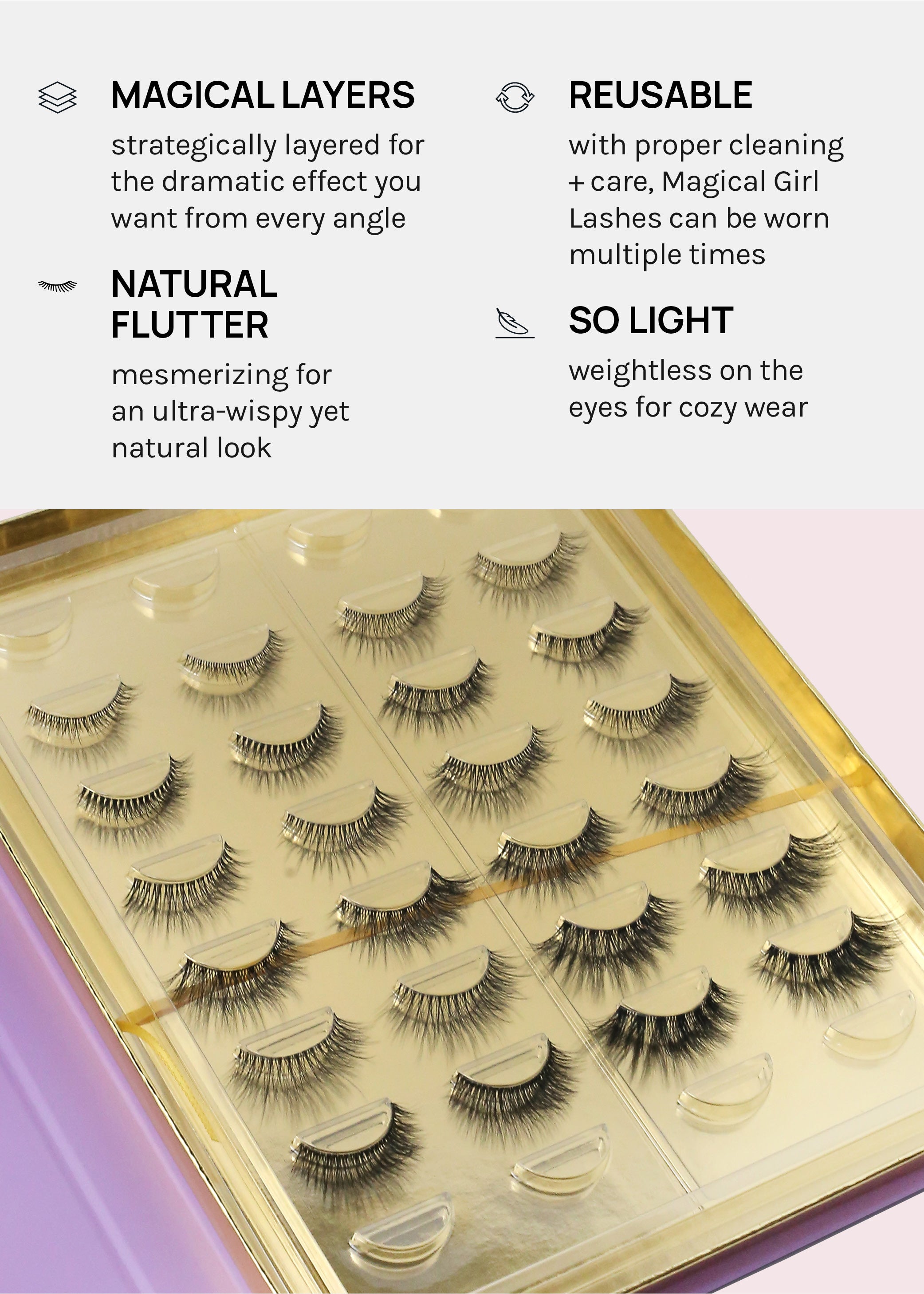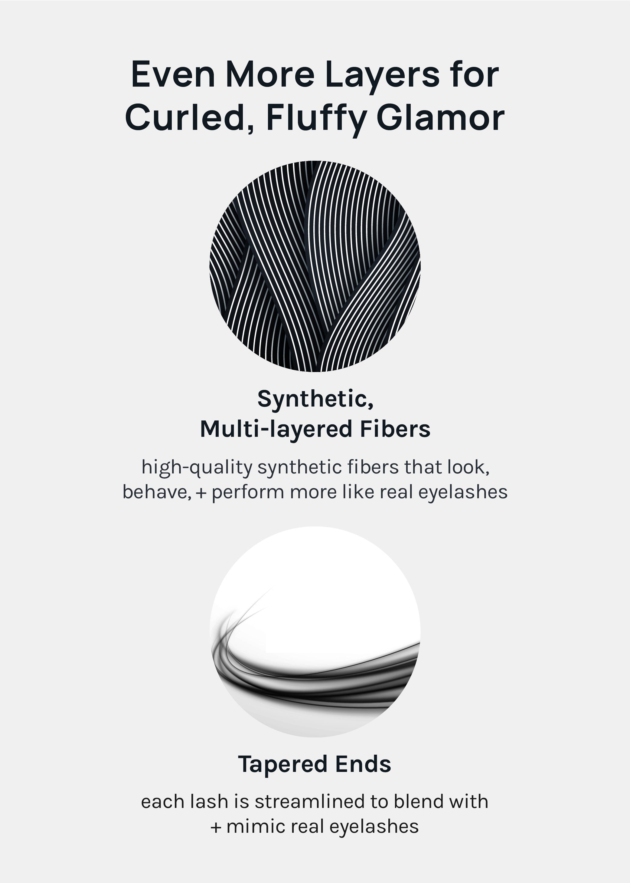 Unleash your magical gaze with 100% vegan fiber, natural, ultra-wispy, layered + fluttery lashes that animate your gaze from every angle.