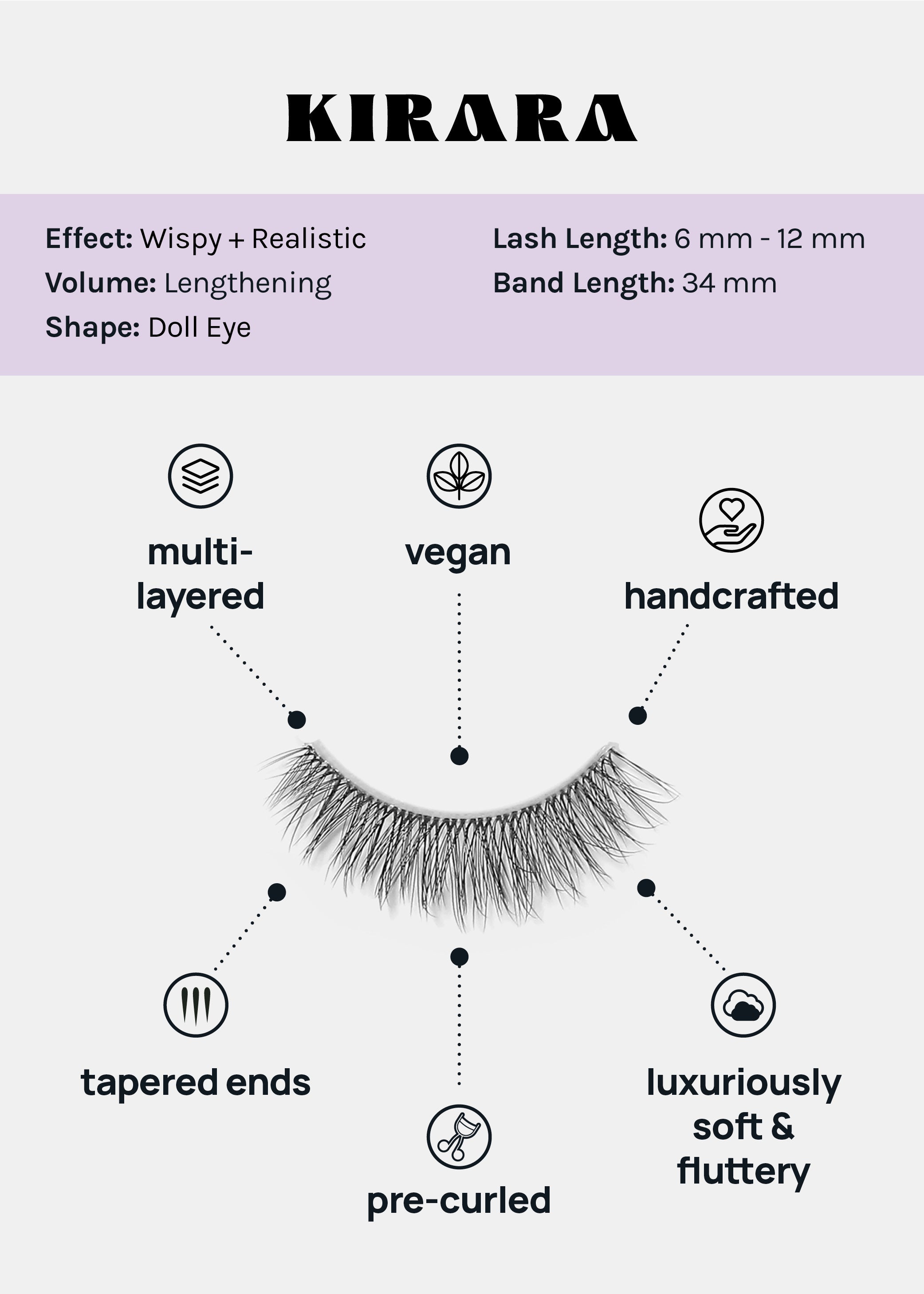 Unleash your magical gaze with 100% vegan fiber, natural, ultra-wispy, layered + fluttery lashes that animate your gaze from every angle.