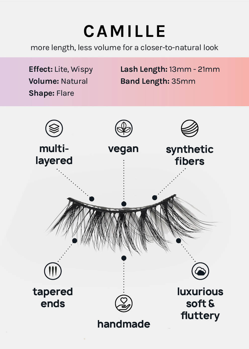 These lashes are vegan, cruelty-free, and made from synthetic fibers. The band is thicker, therefore can be reused multiple times with proper care and cleaning!