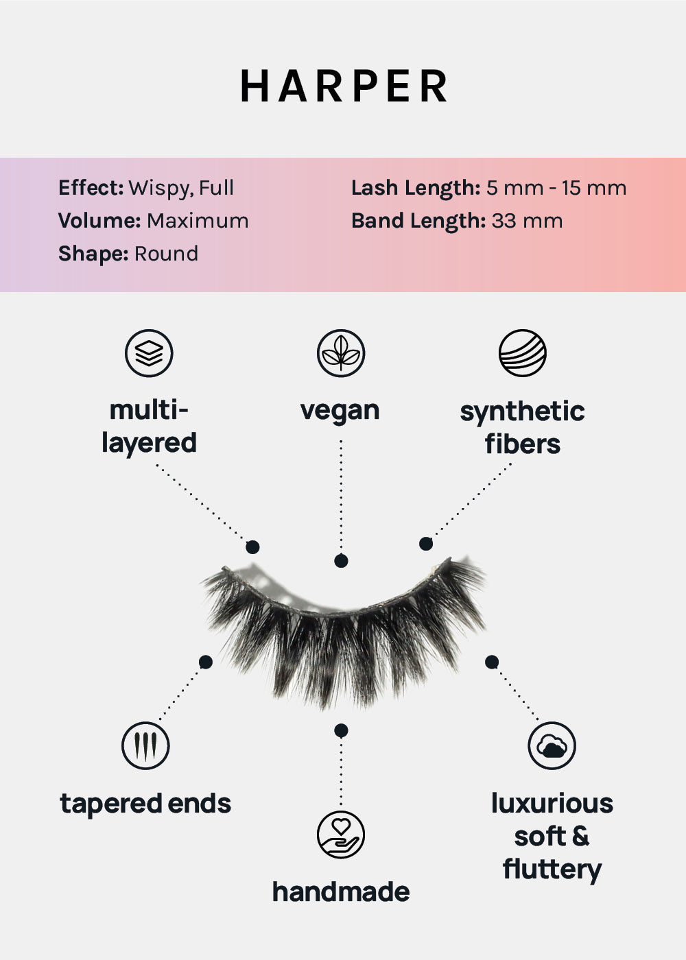 These lashes are vegan, cruelty-free, and made from synthetic fibers. The band is thicker, therefore can be reused multiple times with proper care and cleaning!
